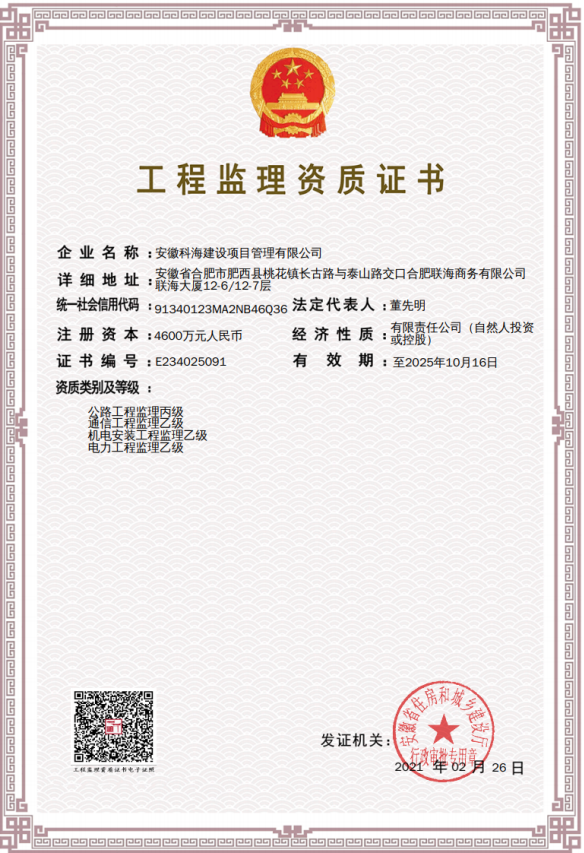 電力工程監(jiān)理乙級(jí)、機(jī)電安裝工程監(jiān)理乙級(jí)、公路工程監(jiān)理丙級(jí)、通信工程監(jiān)理乙級(jí)